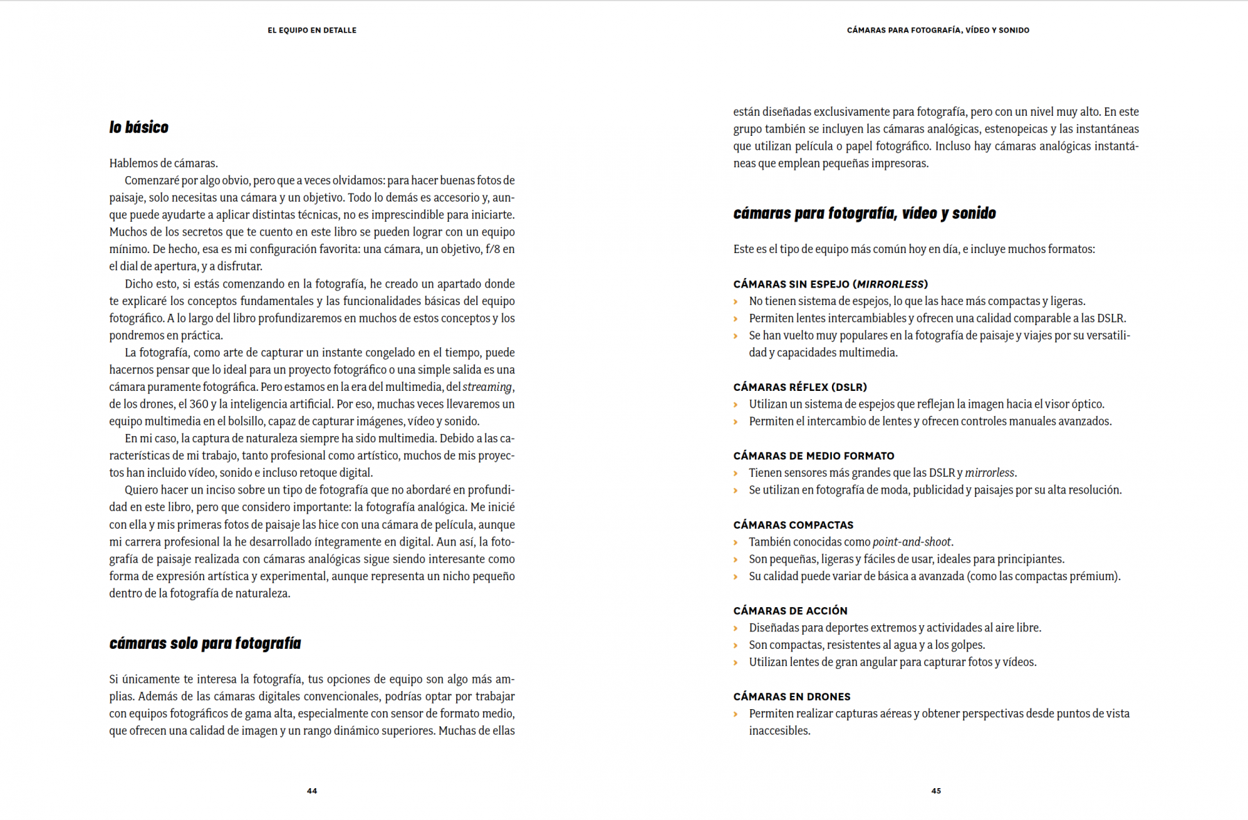 Si amas recorrer el mundo en busca de sus parajes más bellos y quieres aprender a capturarlos con todo su esplendor, en este completo manual el fotógrafo de paisajes Ruben Earth te invita a hacer un viaje de iniciación al arte fotográfico en el que encontrarás todo lo que necesitas para lanzarte sin miedo. Desde la preparación del viaje (planificar según el destino, la mochila, el equipo fotográfico…), pasando por los aspectos técnicos esenciales (los objetivos, el color, la composición…) y hasta llegar a un completo catálogo fotográfico organizado por lugares y situaciones (paisajes blancos, bosques y montañas, mares y océanos; amaneceres y atardeceres, nubes, tormentas…), cada una de las más de 200 fotografías incluidas en este libro se acompaña de los valores técnicos de captura, el contexto y los recursos y consejos que te permitirán ganar confianza con la cámara y conseguir las fotografías que te propongas en cualquier situación.